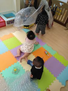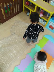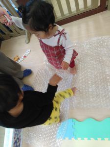 フィリオ便り プチプチ遊び ☆ふたば組☆ 2019年11月8日 プチプチシートで感触遊びをしました♪ これ何だろぉ~? 足で潰してみたり・・・ プチプチのシートを使って“いないいなばぁ”とすると、子ども達は喜んでいました! みんなプチプチした不思議な感触を楽しみながら遊んでいましたよ。 お休みのお友達もいたのでまたみんなで遊ぼうね♪
