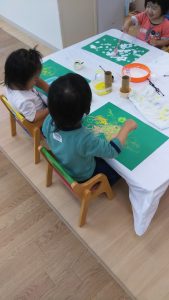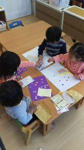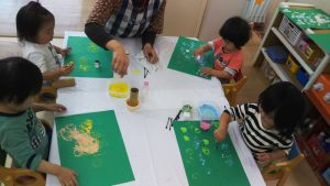フィリオ便り ペタペタ、ポンポン?? そらぐみ♪ 2019年12月6日 ペタペタ、ポンポン?何だろう?答えは… シール貼りとスタンプ遊びー(^^♪ 好きなシールを選んでペタペタ。 絵の具をつけていろいろな素材でポンポン。 どの子も楽しそうでした。 さてさて、何ができるかお楽しみに♪ ヒントは、ク○○○ス☆