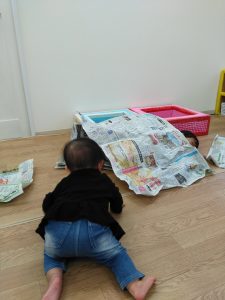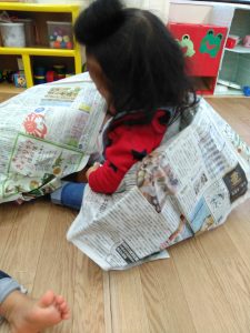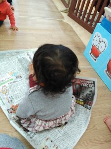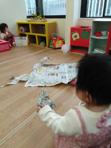 フィリオ便り 新聞紙遊び♪ ☆ふたば組☆ 2019年12月16日 新聞紙で遊びました♪ 新聞紙のお布団でおやすみなさ~い☆ 新聞紙を体に巻いたり、上に乗ってみたりと子ども達は思い思いに遊んでいました! 破るのだって上手なんだよ♪ 身近にある新聞紙でも楽しく遊ぶことができました(^^♪