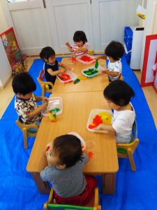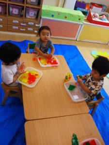 初めての寒天遊び、不思議な感触にちょっと驚いた子もいました。