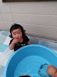 水遊びを始めるとみんな嬉しそうにタライに入った水を