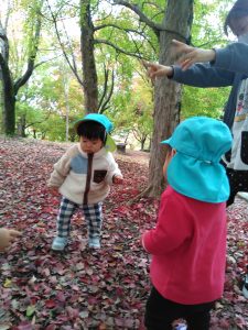 杁ヶ池公園では、紅葉がとても綺麗で子ども達と落ち葉遊びを楽しみました♪
