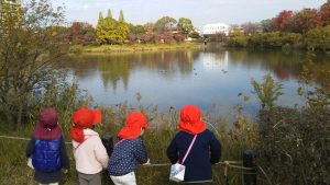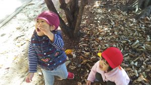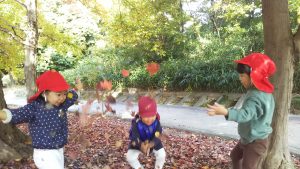 フィリオ便り 秋の公園、楽しいね☀たいようぐみ 2020年11月30日 いつもお散歩に行く公園には、秋の自然がいっぱい! おおきいはっぱ、みつけたよ おかおと はっぱ どっちがおおきいかな? はっぱのシャワー!! たのしいなー! 池にはカモもたくさん来ています! おーい!カモさーん どんぐりや木の実も、いっぱい拾ったね。 あったー! 葉っぱの山も登れるよ!! ヨイショ、ヨイショ またお天気のいい日は公園に行って、楽しいことたくさん探そうね!!