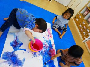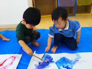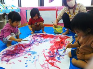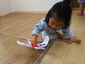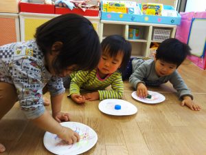 ☆紙皿や牛乳パックに好きな色のクレヨンで模様を描き、オリジナルのこまを作り、こま回しをしました。