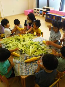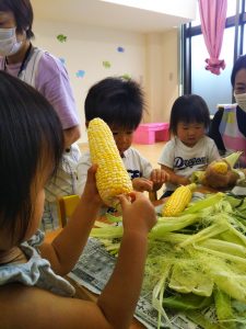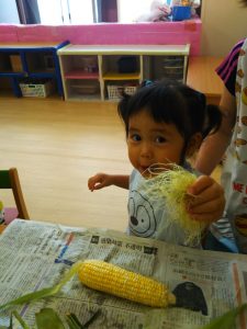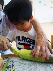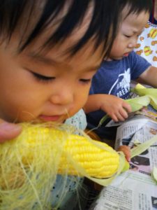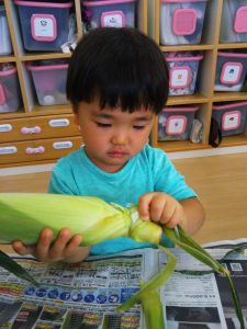とうもろこしの皮むきを体験しました。