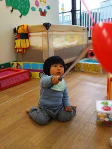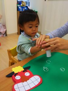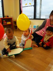 低月齢児の子ども達は羽子板を興味深々で触っていましたよ!