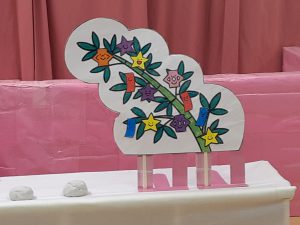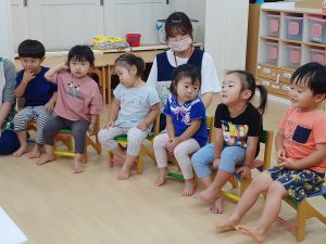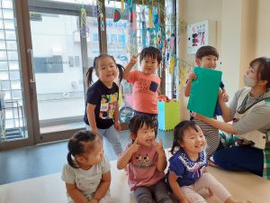 フィリオ便り 七夕会☆ 2022年7月7日 今日は七夕会でした! みんなで「たなばたさま」の歌をうたいながら、 笹飾りをしていきます。 ♪さーさーのーはーさーらさらー かざりがたくさんついてきた! なにができるのかな~ 笹飾り、完成~!! 七夕のペープサートも、みんな楽しく見ることができました! 大きな声で「きらきら星」を歌ったよ! 手のひらをお星さまみたいにキラキラを動かしている子もいましたよ。 笹の葉の下で写真も撮りました! 今夜はお星さまきれいに見えるかな?!楽しみだね。 みんなの願い事が叶いますように!
