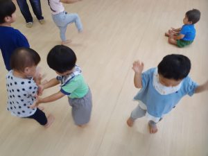 そら組のみんなも、たいよう組の子たちの動きを真似して体を動かしています!
