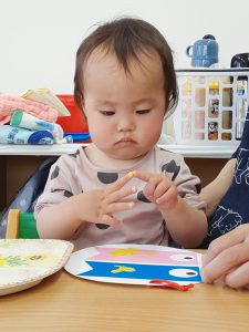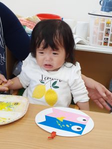 フィリオ便り こいのぼり製作(ふたば組、そら組低月齢) 2023年4月21日 今日は黄色い絵の具を指につけて、こいのぼり製作をしました。 わぁー、お魚だ! なんか手に付いた? ベタベタするね 手が気持ち悪いよぉ 初めての製作はなんだか不思議な経験で終わった子がほとんどでした。 今後も素材に触れる機会を作り、楽しんでいきたいです。 製作物は来週末持って帰る予定です。お楽しみに