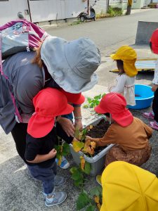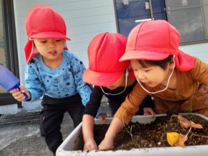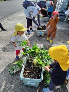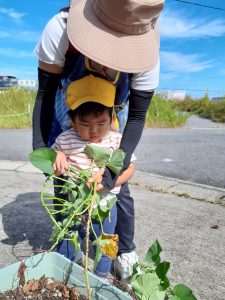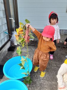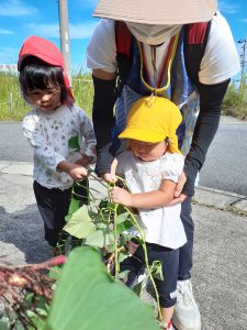 フィリオ便り 芋ほりしたよ☆(そら・たいよう組) 2023年10月11日 今日は子どもたちが楽しみにしていた芋ほりをしました! わぁ~お芋大きくなったね! みんなで力を合わせて~ うんとこしょ!よっこいしょ! お芋とれたよ~!! そら組さんもお芋ほりに挑戦しました☆ なかなか抜けないよ~ お芋どこかに隠れていないかな~? たくさん採れて大満足な様子の子ども達でした! 後日みんなで食べたいと思います♪
