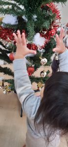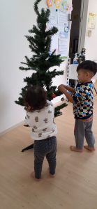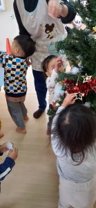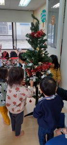 フィリオ便り クリスマスツリーの飾り付け☆ 2023年12月5日 今日はクリスマスツリーの飾りつけをしました! オーナメントを見せるとみんな興味深々!! わぁ~なにこれ! 上手に飾りつけできるかな? どこに付けようかな~? う~ん、高いところは届かないよ~! 子どもたちのおかげでこんなにきれいなツリーが完成しました! 「かわいいね」と子どもたちも大満足な様子でしたよ。 玄関に飾ってあるので、送迎の際にぜひ見てください。