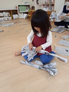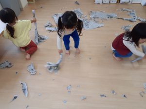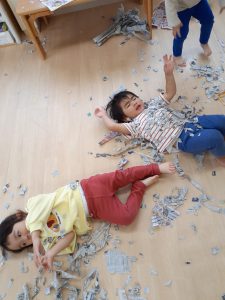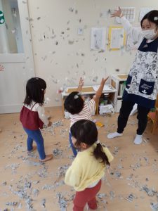 フィリオ便り 雨の日のしんぶん遊び(たいよう組) 2024年5月13日 今日はあいにくのお天気です。 たいよう組さんはお部屋で新聞遊びをしました。 しんぶんのお布団だよ ほうきを作ってもらったんだぁ さっさか、さっさか、みんなでお掃除 最後は紙吹雪だぁ~ いっぱい降ってくる~ 最後は片付けた新聞紙で、大きなおばけを作りました。 雨でも、たのしかったね!! また新聞でいっぱいあそぼうね