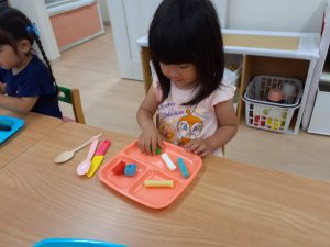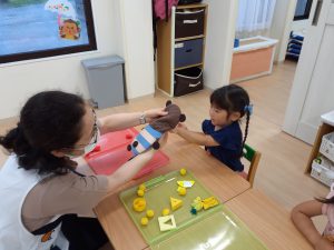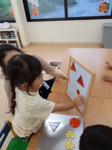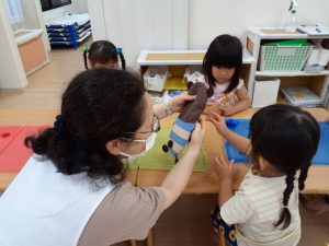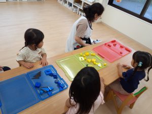 フィリオ便り 楽しい知育あそびの日 2024年6月18日 今日は3回目の知育あそびの時間です。 中には初めての子もいました。 何が始まるのかなぁ、何が出てくるのかなぁ くまさんにパクパクパク。美味しい? 三角はこれかな みんな、三角四角丸などの形や色を理解して取り組むことができていました。 知育あそびのあとは、カラフルな小麦粉粘土でも遊びました。 盛りだくさんの活動でしたが、とても楽しんでいました。 この粘土、さわると気持ちいいよ 知育あそびは雨の日など外に出かけることができない時に 年間通してまた楽しんでいきたいです。