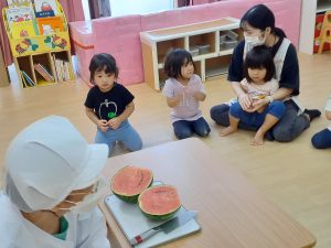 フィリオ便り スイカを切ってみよう(たいよう組) 2024年8月2日 今日は食育として子ども達の前の目でスイカを切ってもらいました。 わぁ~スイカだ~! 調理員さんが切ってくれるのをワクワクしながら待っていました! 真っ赤でおいしそう! 午後のおやつに出ることを伝えると「やったー」ととても喜んでいました。 切ったスイカはとっても甘く、子ども達も「あまい!おいしい!」と言いながら食べていましたよ!