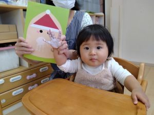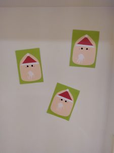 フィリオ便り クリスマス手形製作(ふたば) 2024年12月9日 クリスマスの製作で手形をしました。 まずは手の平に筆で白い絵の具を塗ります。 なんかくすぐったいなぁ ぺったん 「おててぱっ」と声を掛けると、上手に手の平を広げてくれました。 上手にできたでしょ? かわいい3人のサンタさんの完成です。