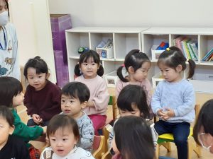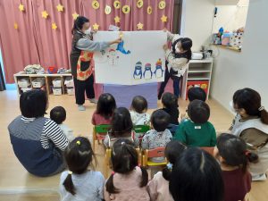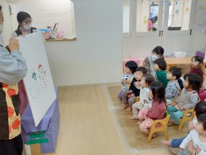 色々な動物が出てきて雪だるまのサンタさんにプレゼントをもらう可愛いお話で、みんな真剣な表情で見ています!