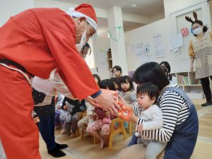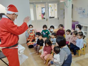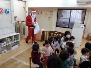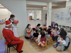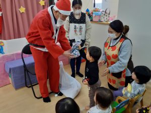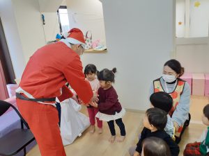 パネルシアターが終わるとどこからか鈴の音が聞こえてきて、なんとサンタさんプレゼントを持って来てくれました!