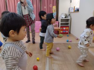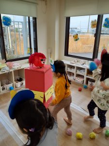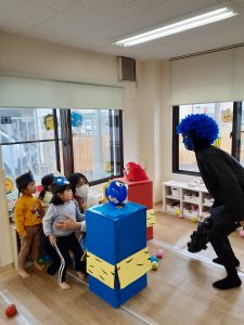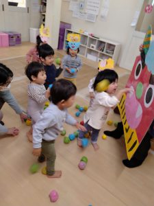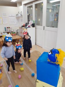 まめまき会のあとは、豆にみたてたボールを鬼の的にぶつけて遊びました。