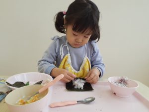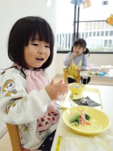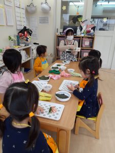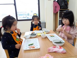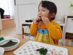 鬼を退治し、ほっと一安心。たいよう組さんは給食に手巻き寿司を作って食べました。