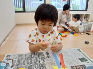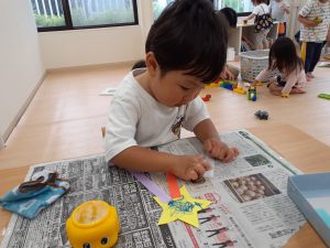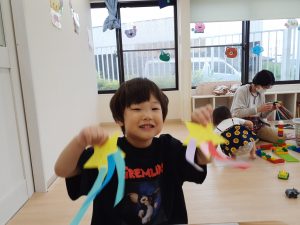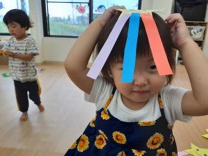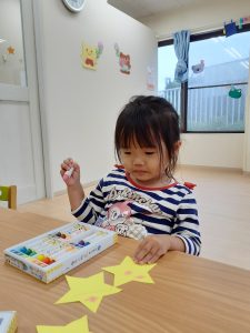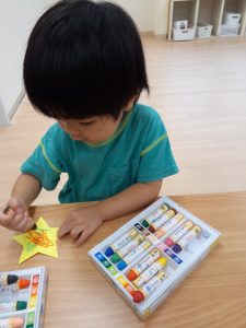 フィリオ便り お星さま作ったよ(たいよう組) 2025年6月11日 愛知県も梅雨入りし、雨の日が続いています。 たいよう組のみんなは七夕の製作をしましたよ~ まずはお星さまにお顔を描きます すきな色を使って描いたよ お絵描きたのしい! そして翌日は、糊を使って飾りをつけました 糊をぬりぬり・・・ ぺったん。じょうずに貼れるかな? できた!! みてみて!ぼうし! かわいいお星さまがたくさんできました! 笹に飾るの楽しみだね。