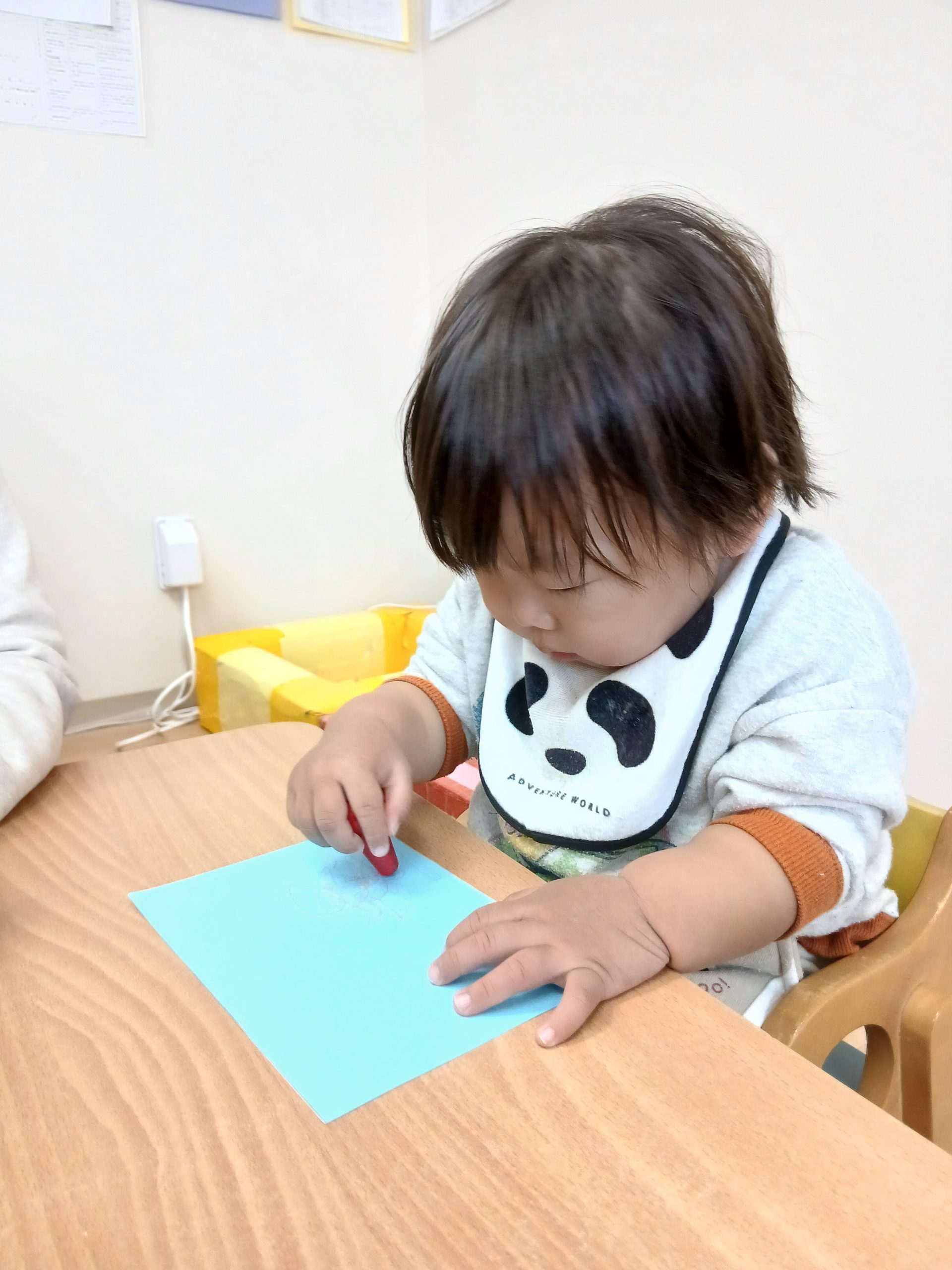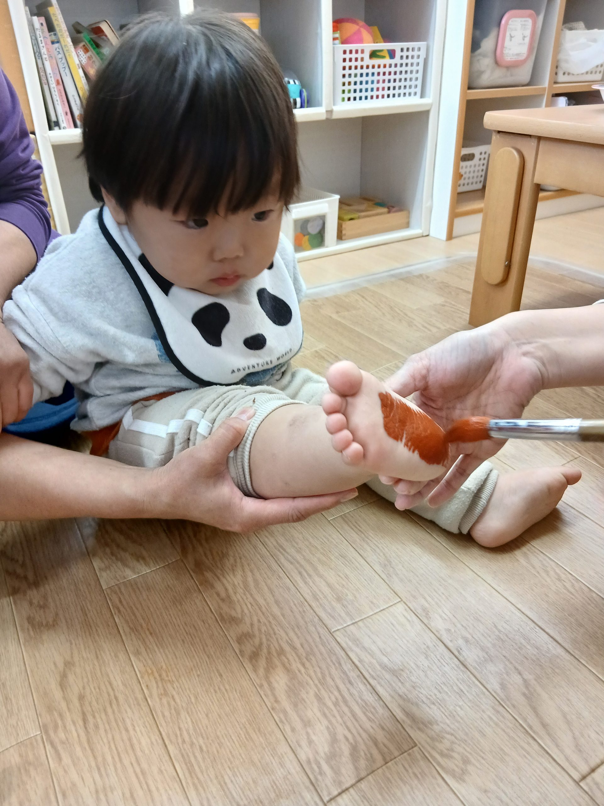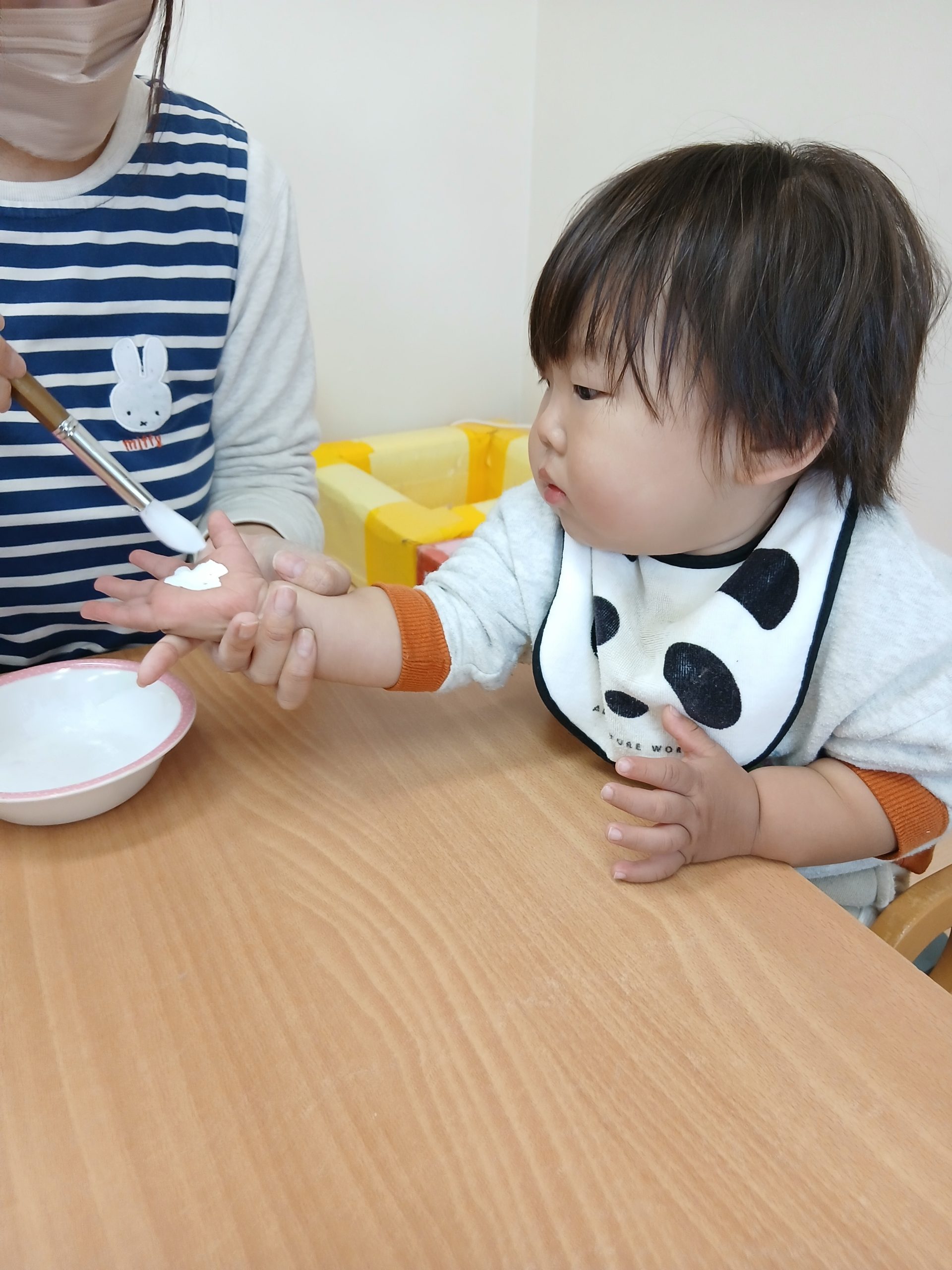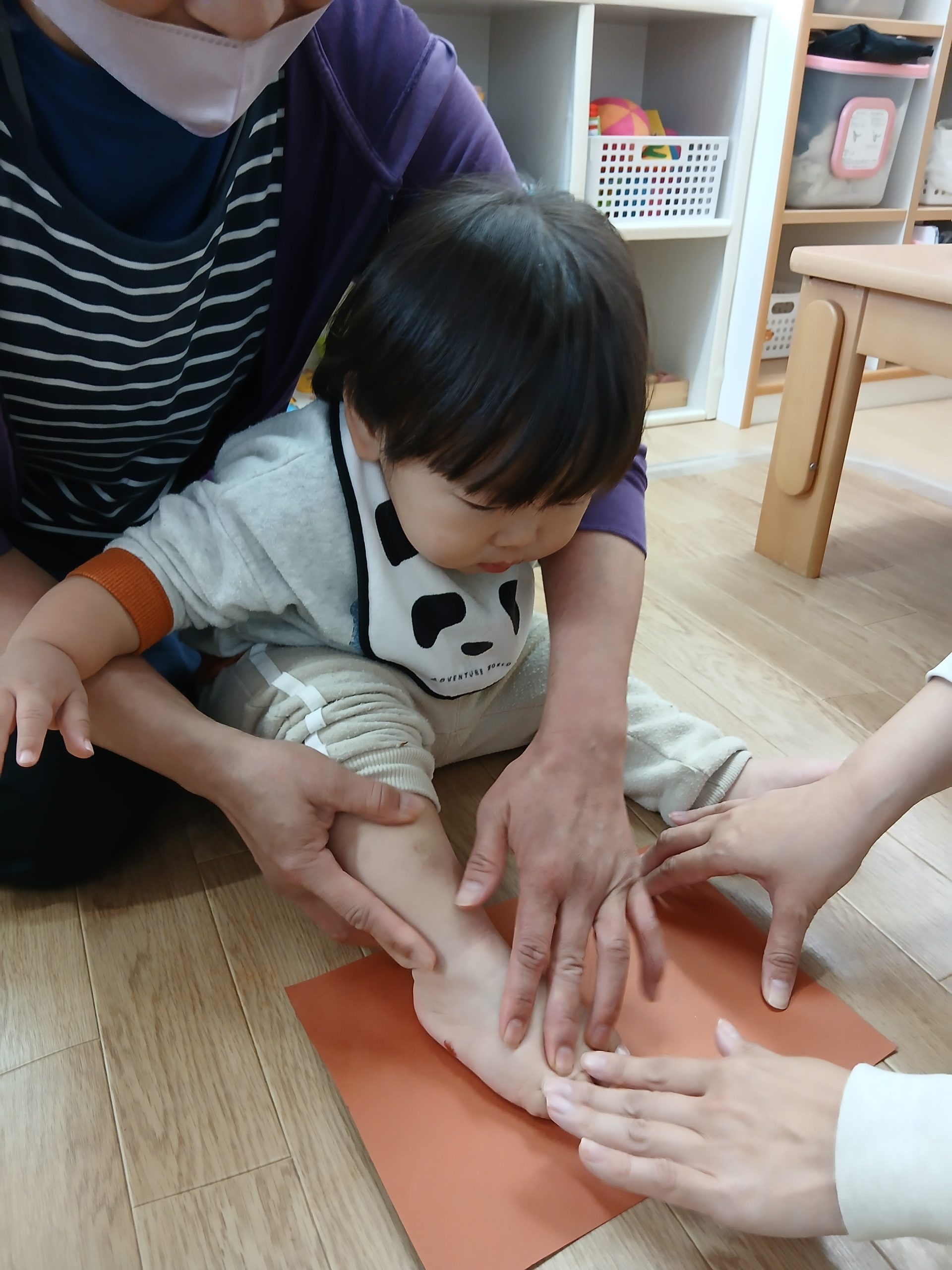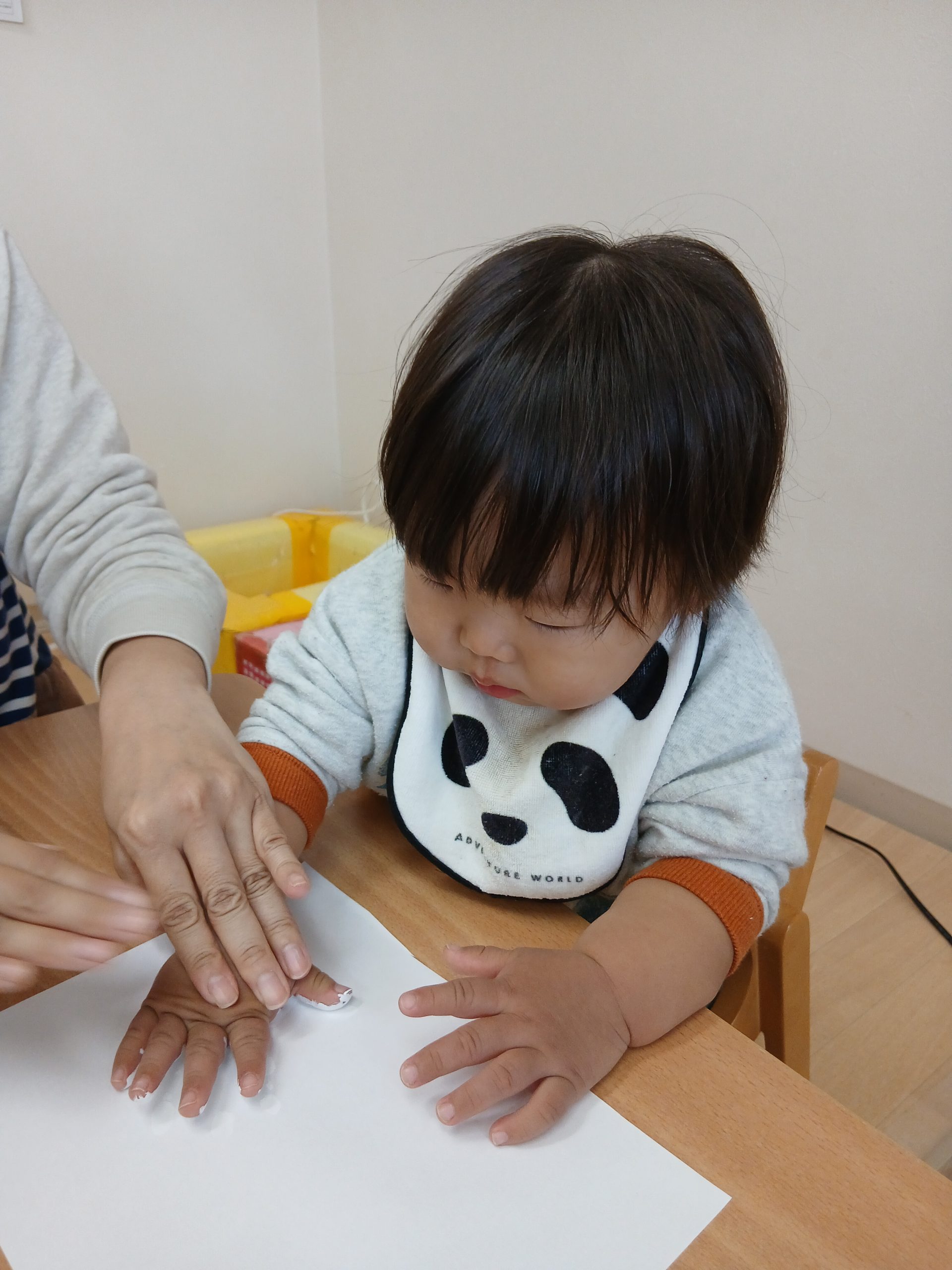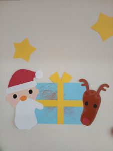 フィリオ便り クリスマス製作☆(ふたば組) 2025年12月9日 早いもので気が付いたらもう12月ですね! 12月ということで、クリスマスの製作を行いました♪ まずは画用紙にクレヨンでお絵描きしました。 なに描こうかな~? その次は手に絵具をぬりぬり・・・ わぁ~なにこれ!なんか変な感触! 塗れたら画用紙にペタっと手形を付けました! 手形の次は足形です☆ あんよが茶色になっちゃったー! これを全部合わせると~? サンタさんとトナカイとプレゼントに変身しました! クリスマスが待ち遠しいですね♪