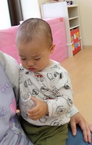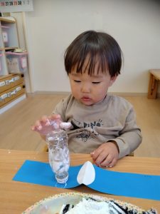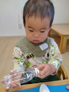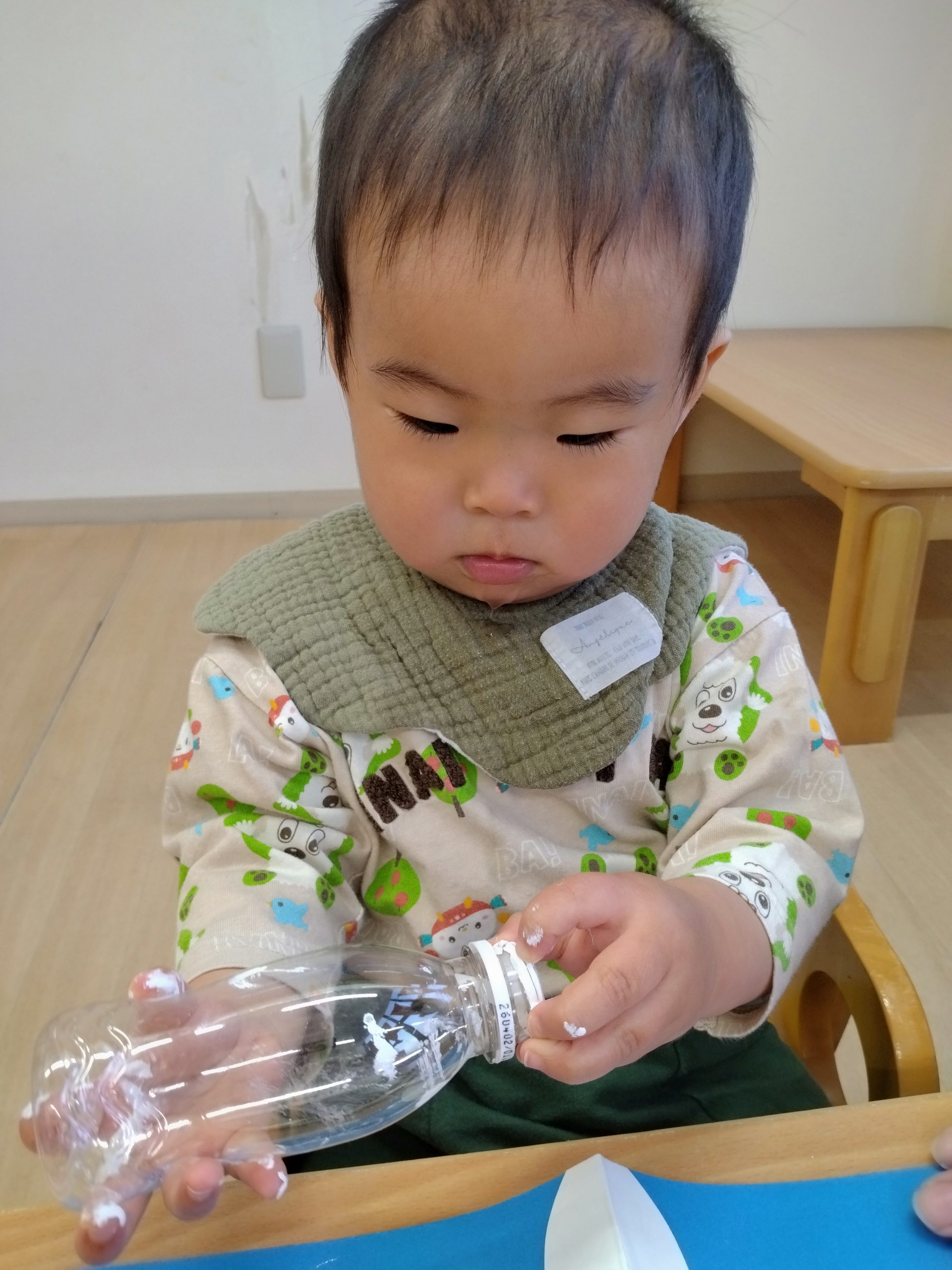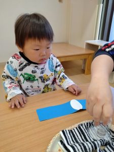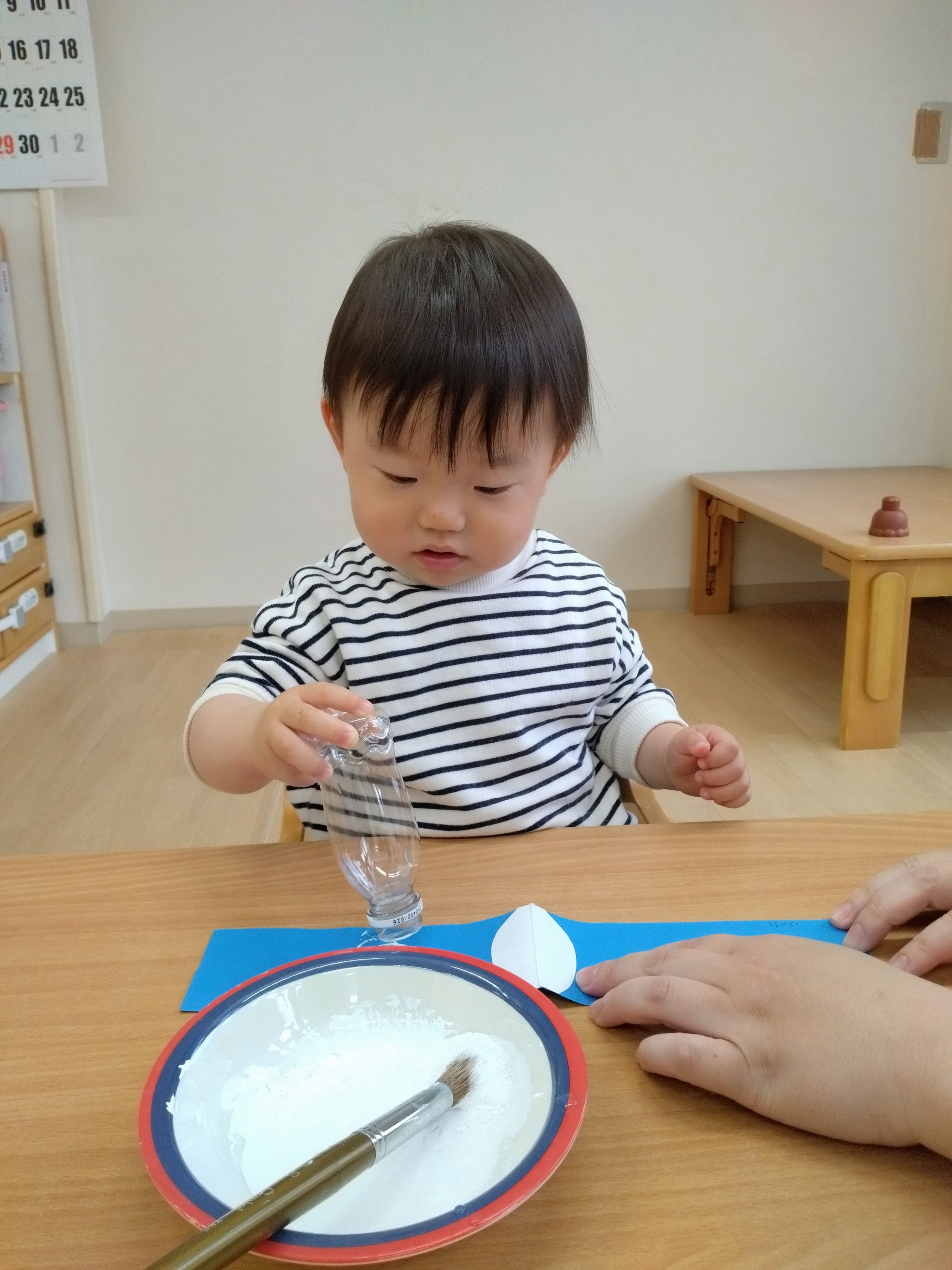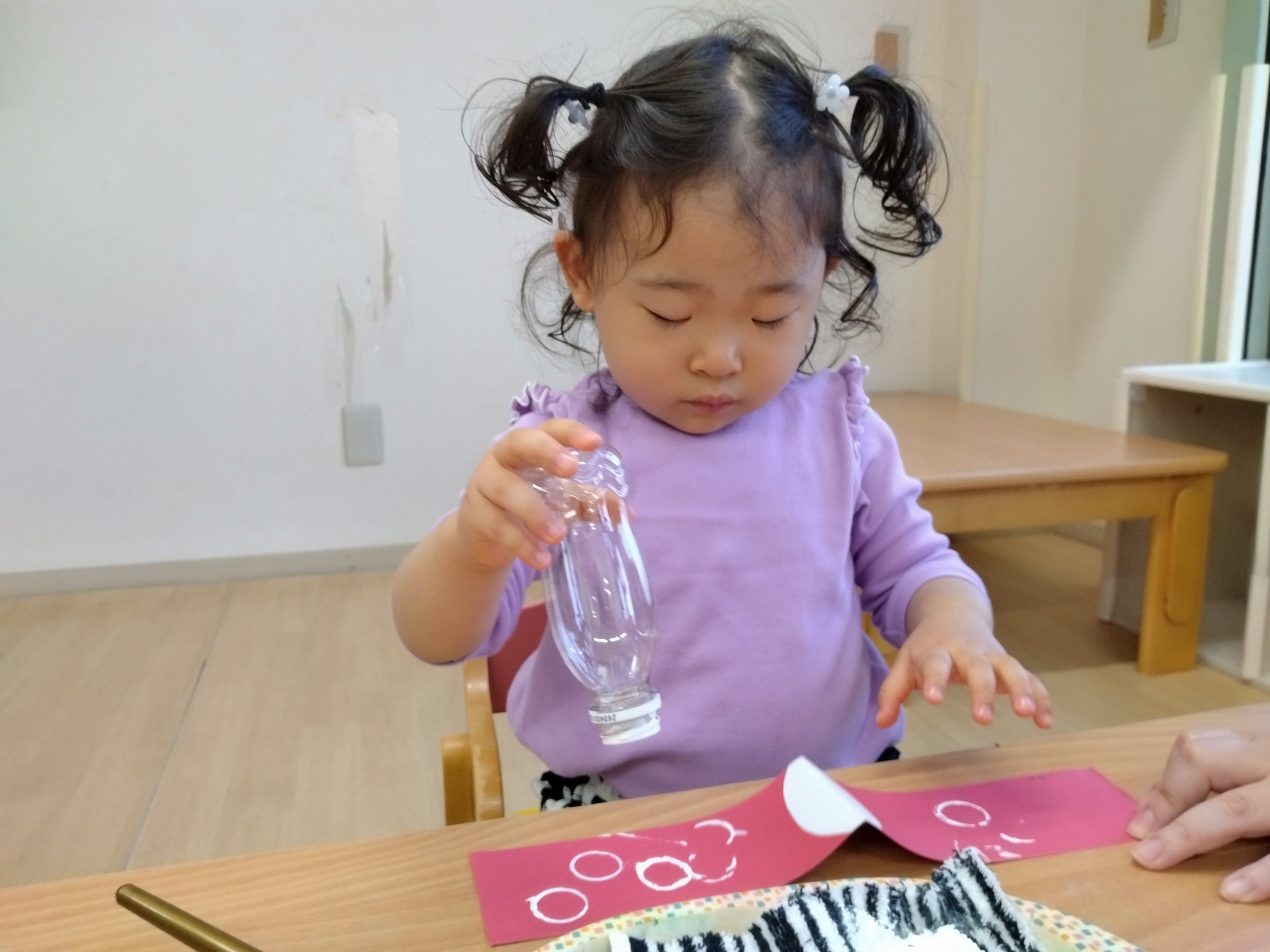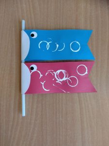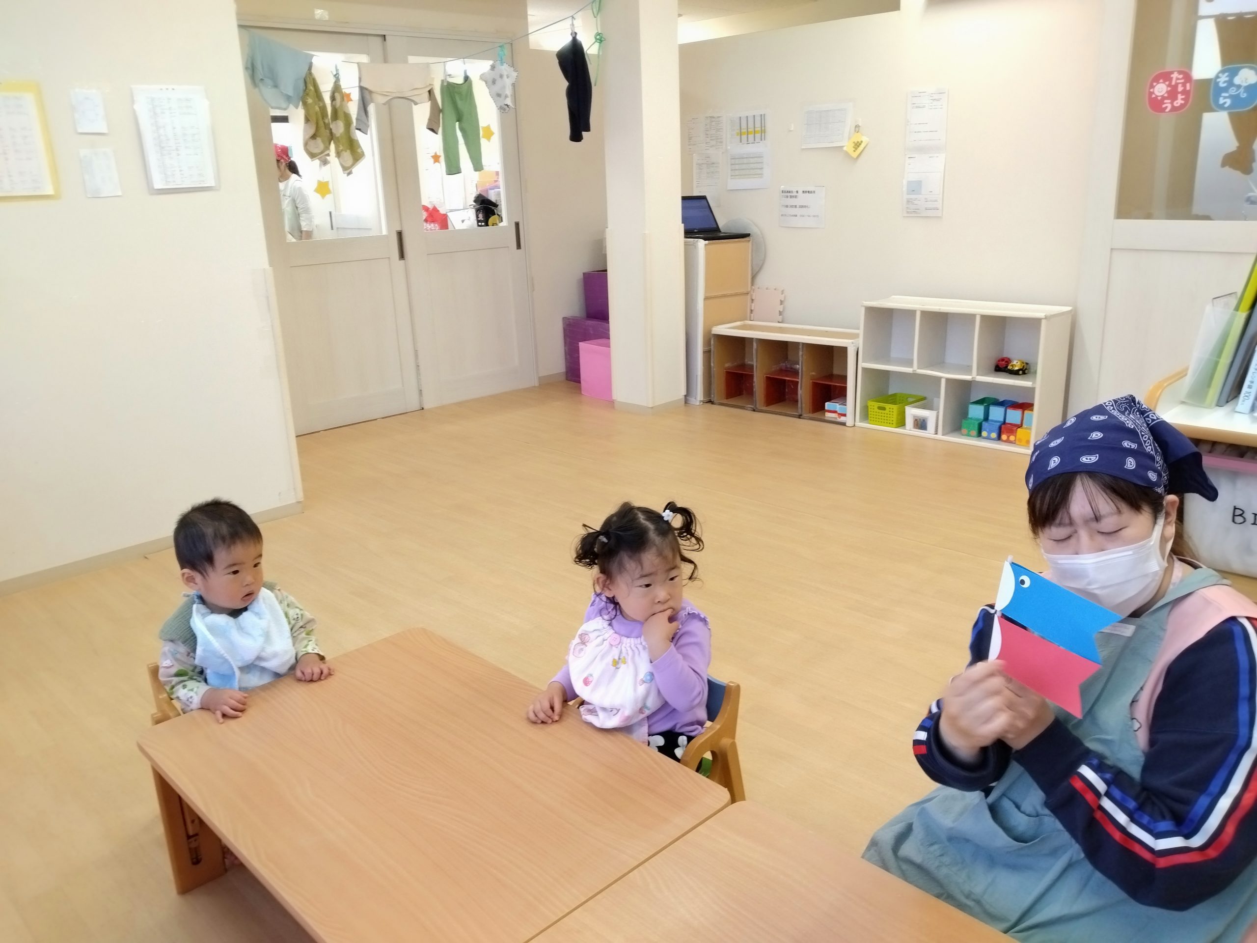 フィリオ便り こいのぼり製作☆(そら組) 2026年4月27日 こいのぼりを作りました。 そら組さんになり、初めての製作です! 見本を見せながら説明すると、興味津々の様子です。 こいのぼりを作ろうねー 何をするのかなぁ・・・ スタンピングをする空き容器に夢中なお友だちもいました。 なんかつるつるしてる・・・ ポンッとスタンプ! 絵の具がついたよ! 何度もポン、ポン、ポン! 可愛い可愛いこいのぼりの完成です!